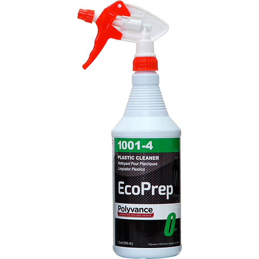Polyvance's EcoPrep is a zero VOC plastic cleaner designed to perform as well as solvent-based plastic cleaners when preparing plastic for repair and refinishing operations. EcoPrep has no use limitations in tightly controlled VOC regions and is the perfect substitute for Super Prep Plastic Cleaner when a solvent-free cleaner is desired. EcoPrep is an approved cleaner for use with Bumper and Cladding Coat Adhesion Primer. Use EcoPrep before every plastic repair and refinishing job to ensure the best performance of fillers, paints, adhesion promoters, and other plastic repair applications. EcoPrep Plastic Cleaner is a water-based plastic cleaner with powerful surfactants that will remove release agents, oil, grease, bumper sticker residue, tar, etc. And, because it is zero VOC, it can even be used in California where they have Draconian rules on VOC emissions. It comes in a trigger sprayer bottle, so you won't have to worry about California's Draconian aerosol rules, either. Just spray it on in a heavy, wet coat. Wait a few seconds for it to emulsify the crud and wipe it off with a clean cloth in one direction.