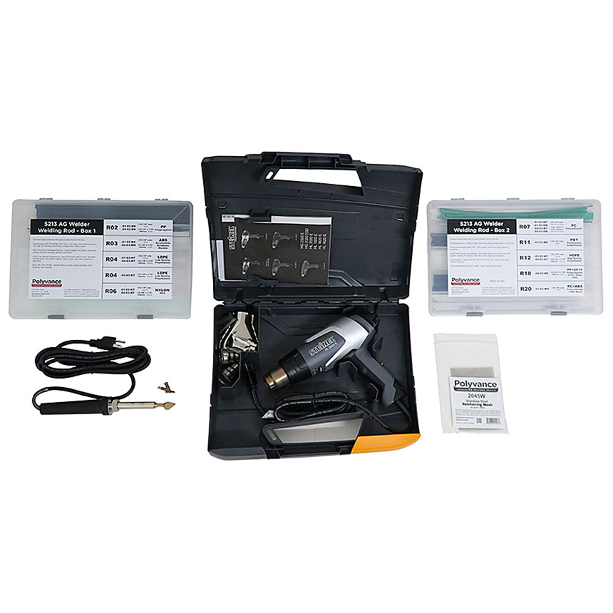 Polyvance's Agricultural Plastic Welding has includes a hot-air welder, an airless welder, and selection of plastic welding rods that are most commonly used in agricultural farm equipment. This kit can be used to repair tractor hoods, water storage tanks, stock tanks, spray tanks, cornhead snouts, ATV fenders, fuel tanks, and more. 120 volt.