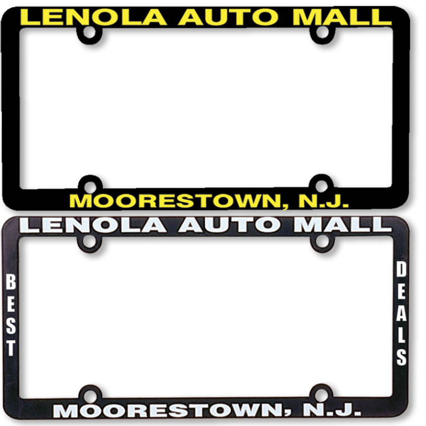 Keep your name with the vehicle! Our Premium Dealer License Plate Frames are very durable and won't crack in extreme temperatures. These frames are printed with two colors. Personalizing is easy and no set-up fee is required. Start by choosing white or black for your frame color. Then, choose an ink color for your screen imprint and enter your custom information. Price includes two color imprint, with no changes in copy. Changes in color or copy are considered separate orders, and cannot be combined for quantity discounts. Please note: Black frames printed with a color other than white are 2 color. Single-color frames are available as part# 1300619. Within 3–5 business days, you will receive a proof to your email address. Order will ship in 12–15 business days once you approve the proof. Frame panel sizes are: