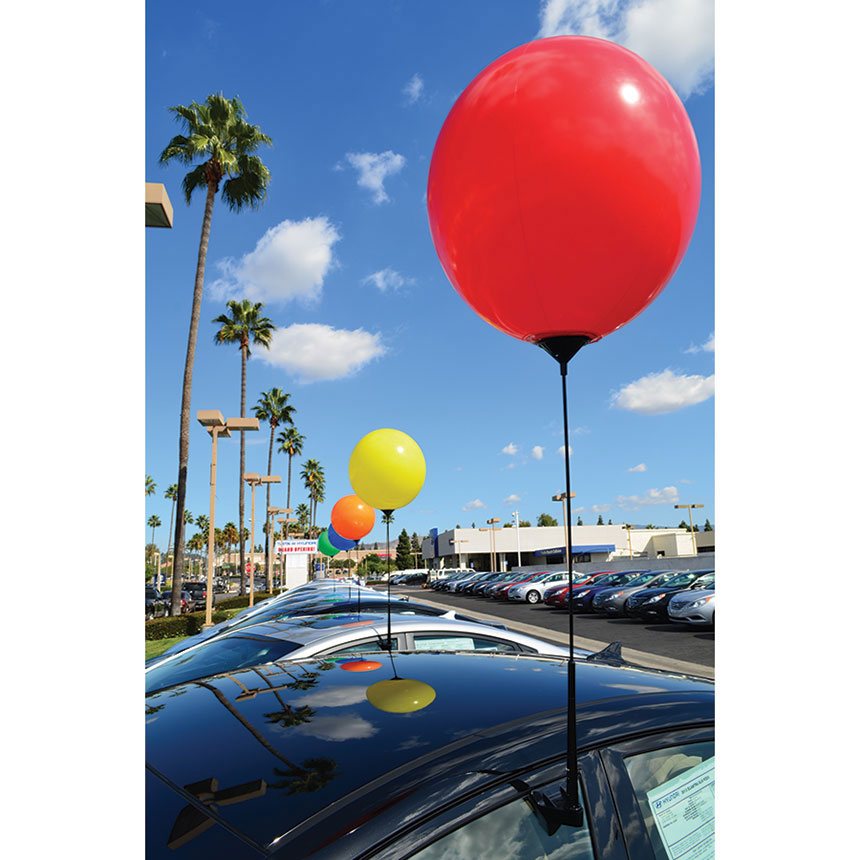 Add excitement to your lot and eliminate the cost of helium. Blow up the Reusable Balloon just like a beach ball and attach it to your choice of a Clip-on Window Pole Kit, sold separately as 1301881.Vinyl balloon balls will stay inflated for days under normal weather conditions. Balloons are 20" and oval shaped.