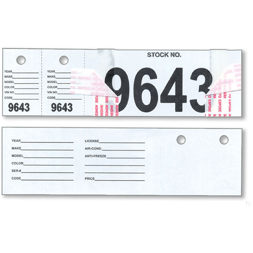 Keep a tight inventory with these smartly designed stock tickets, which keep you neatly organized. Each ticket has two key tags and a sticker with peel off adhesive strips for easy application. Stock sticker and key tags are numbered to keep vehicles and keys quickly identifiable. 500 tags and rings per box. Key Tags are each 1 3/16", overall ticket size is 7" x 2".
