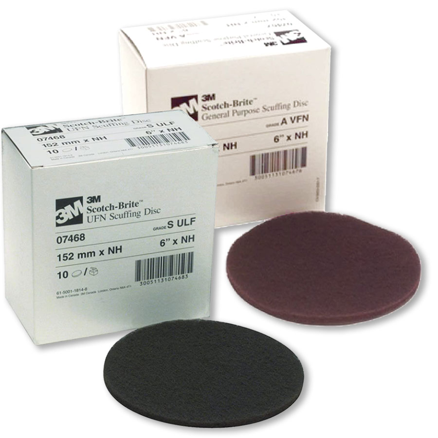 The 3M Scotch-Brite 6" Scuffing Discs give you a faster and more efficient way to machine scuff final sanding of primer-surfacer. The scuffing disc attaches to 3M Hookit Disc Pad 05776. and is available in colors Maroon (07467) and Gray (07468). The scuffing discs are available in two grades Ultra Fine and General Purpose. The scuffing discs have abrasive mineral type Aluminum Oxide (07467) - Silicon Carbide (07468).