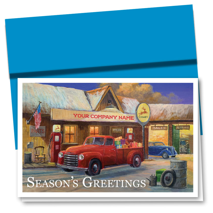 This double personalized card features your company name on the front so that it becomes part of the design! The card inside is printed with the holiday message of your choice and your company name.