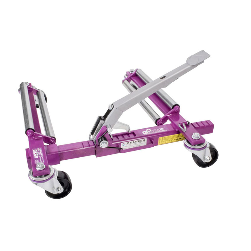 The Model G4520 Super-Slick was developed for the race car industry. You can effortlessly lift and move cars with tires as wide as 20 inches and up to 36 inches tall. The unit will handle wheel weights of 1,125 lbs. (up to 4,500 lbs with four units). Twin rollers on each axle guide the tire smoothly up and over the axle support bar to lift wider tires. This auto jack / auto dolly unit uses a bi-directional linear ratchet for the jack portion and has a 5-degree offset pedal angle for additional foot-to-tire clearance.