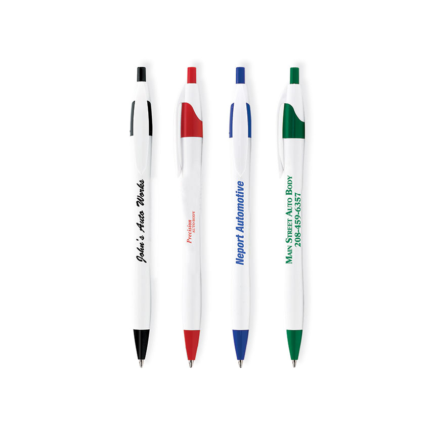 Featuring a popular contoured design, this pen is smooth writing and very economical. Available with a white or colored barrel.