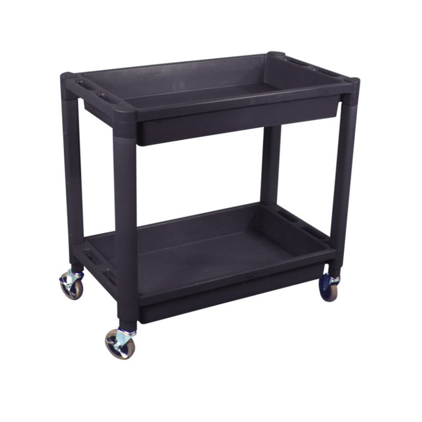 This cart has two handles on each side and can be pushed or pulled from either side. The 2 trays are 31/2" deep. Features 4" swivel heavy-duty casters and non-marking tread. 300 lb capacity. Size: 16"W x 30"L x 31"H.