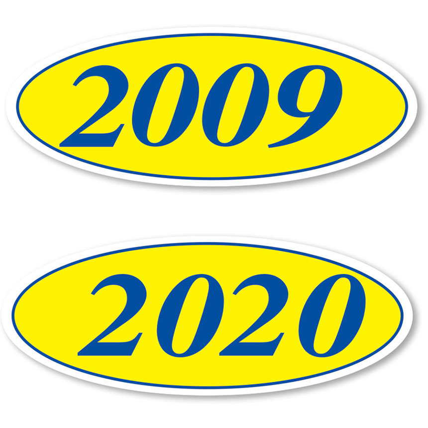 Blue & Yellow Oval Year Stickers made of durable, waterproof vinyl, these non-fade signs demand attention! Each year sticker is slit on the back for easy application. Blue & Yellow Oval Year Stickers neatly shrink wrapped in packs of a dozen with a cardboard backer to prevent curling during storage. Blue & Yellow Oval Year Stickers measure 14"W x 5 1/2"H.