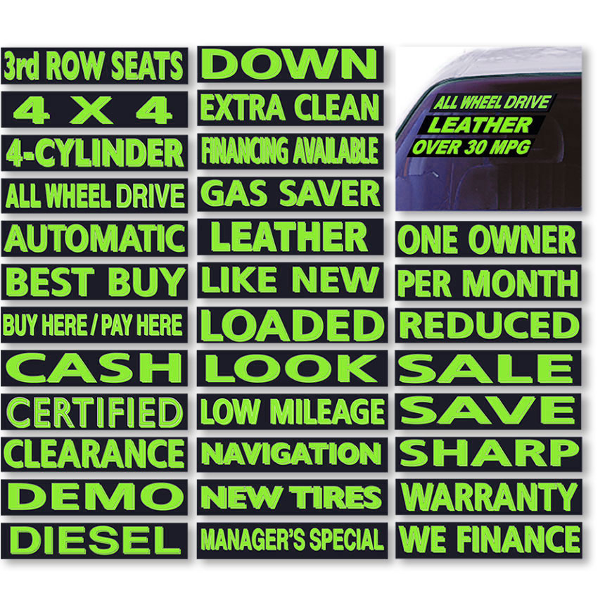 Vehicle windshields provide you with a very unique advertising opportunity. Use each vehicle as advertising for your dealership with our Black & Chartreuse Budget Windshield Slogans. Black & Chartreuse Budget Windshield Slogans allow you to promote each vehicle and help attract future buyers. Brilliant windshield slogans are made of a durable waterproof vinyl. Each Black & Chartreuse Budget Windshield Slogan is available in dozen lots and is 14 ½"W x 2 ¾"H.