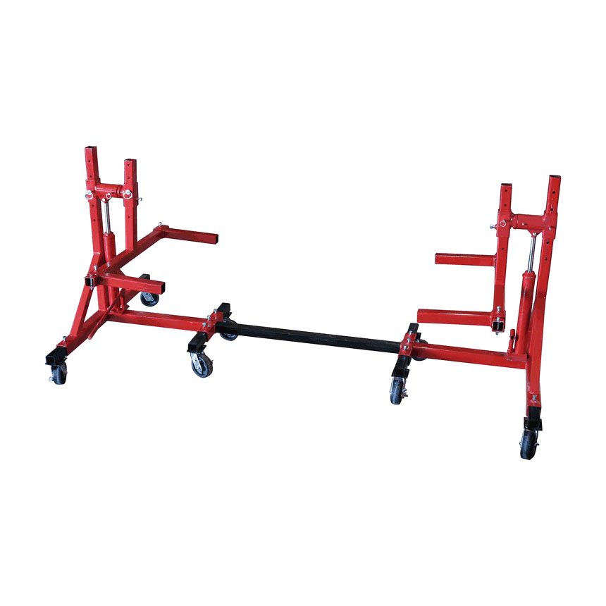 The Champ Deluxe Hydraulic Frame Rotisserie is designed to hold automotive frames and stripped frames only. It has two height adjustments and one rotating adjustment that help in locking at the required height. It also has adjustable bracket support arms to fit the vehicle frame. To use this frame rotisserie, first install wheels into the support base, and lock them in place by tightening the locking bolt. Insert the beam into the frame support stands before loading the vehicle.