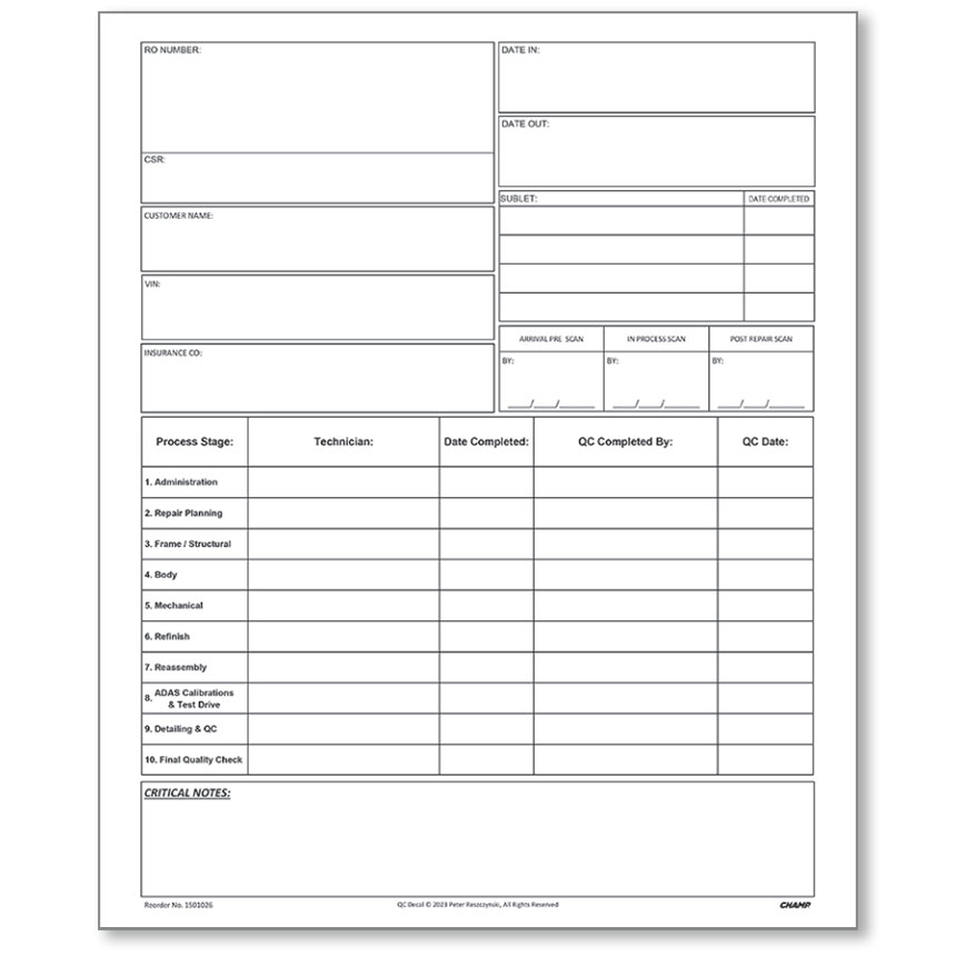 In addition to listing ten different stages in the repair process, the QC Decal includes specific boxes for: