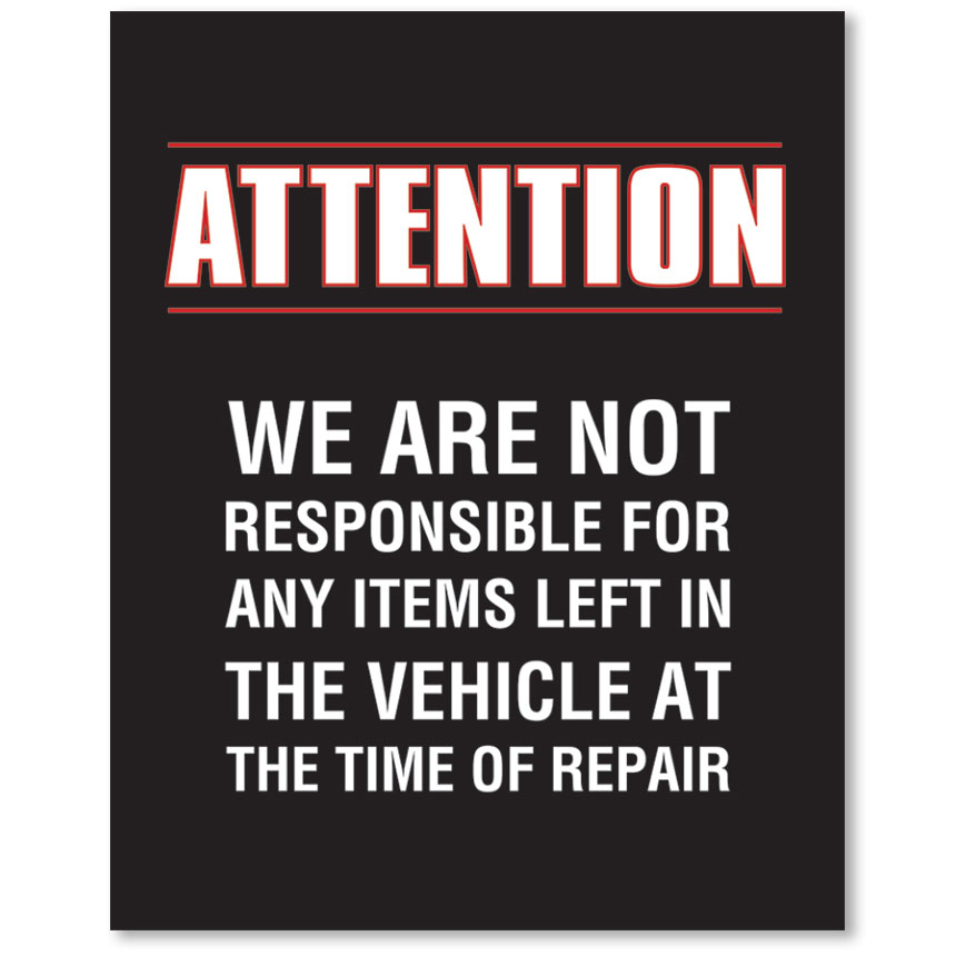 These vivid high-gloss signs make it easy to inform your customers of your policies on payments, insurance and customer service. Double-stick foam is included for easy mounting. Black Acrylic.