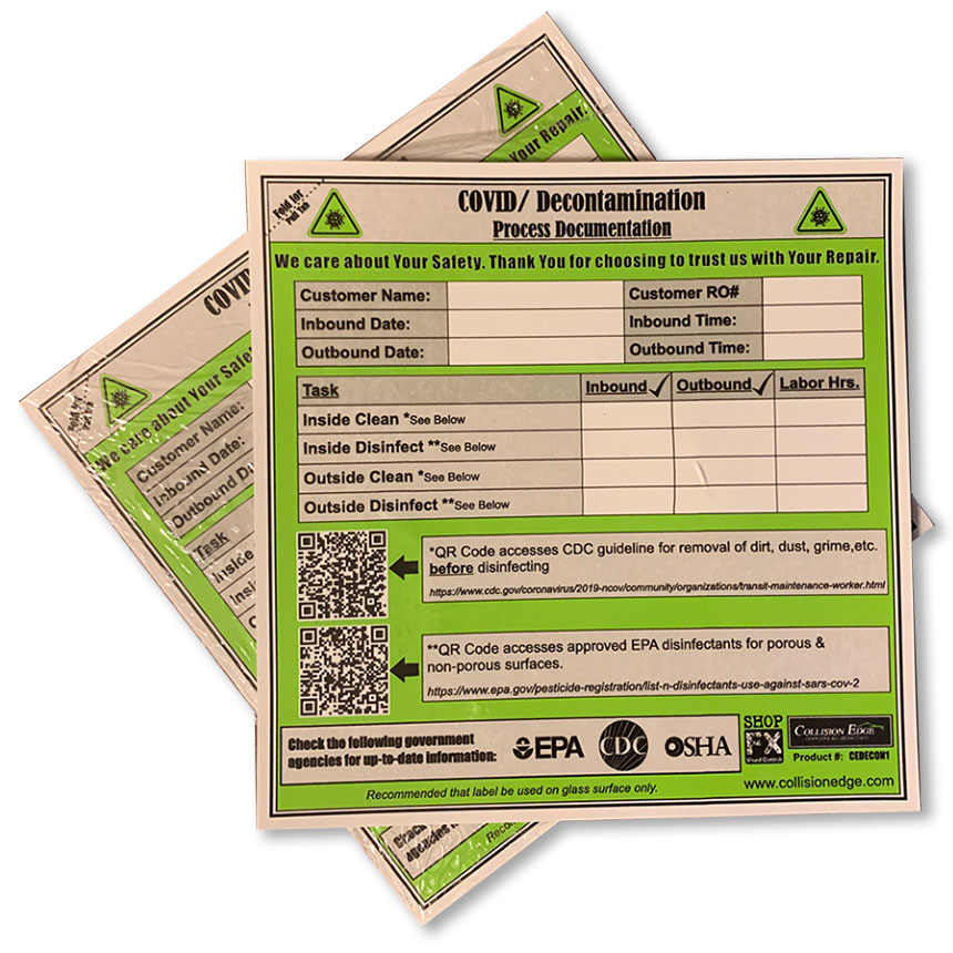 Per CDC guidelines, before a vehicle is properly disinfected it must be cleaned to be free of debris, dust, grime, etc. In ANY areas employees/customers touch, it is crucial to complete both processes on the inside and outside of the vehicle. The COVID Cling Decontamination Label helps track those processes per customer