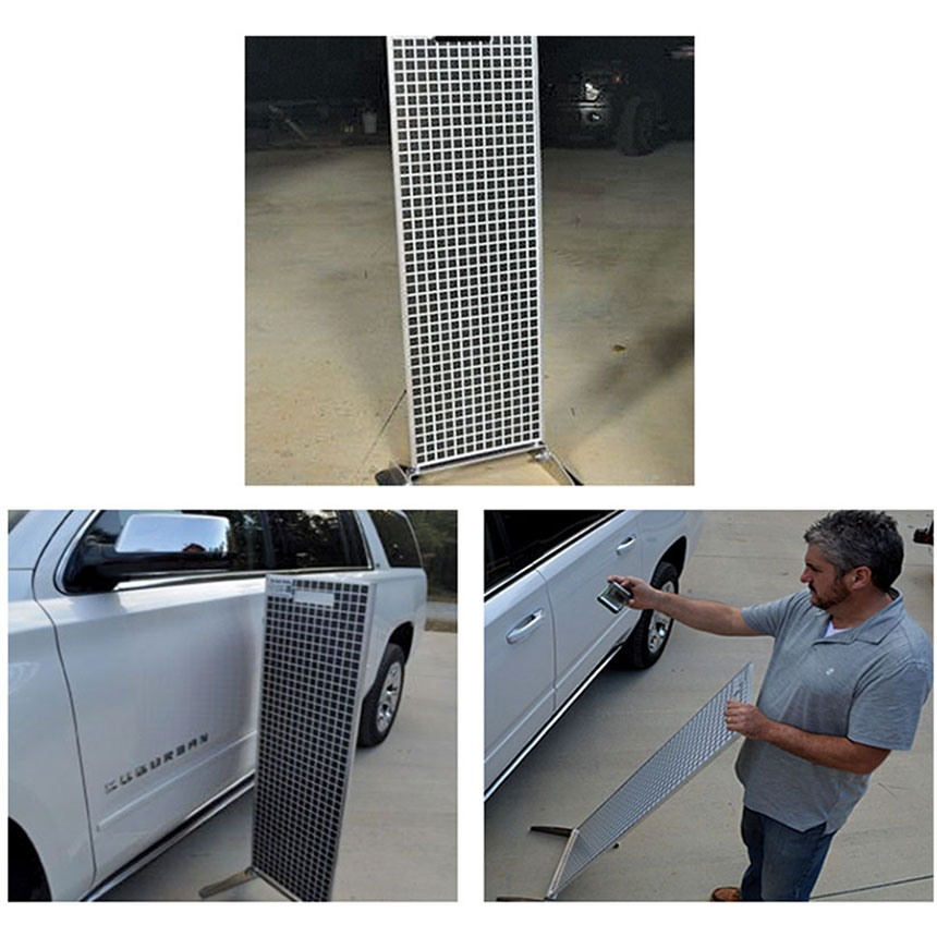 The XL is a freestanding, articulating board with the same premium reflective film as its little sister, The Dent Viewer. The reflective film uses the camera flash to cast a grid over your damaged panel showing 100% of the damage. This larger version will capture a larger area of damage and is perfect to sit in your blue printing bay.