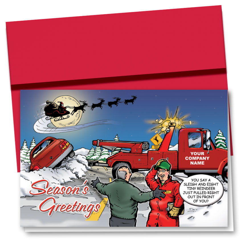 This double personalized card features your company name on the front so that it becomes part of the design! The card inside is printed with the holiday message of your choice and your company name.