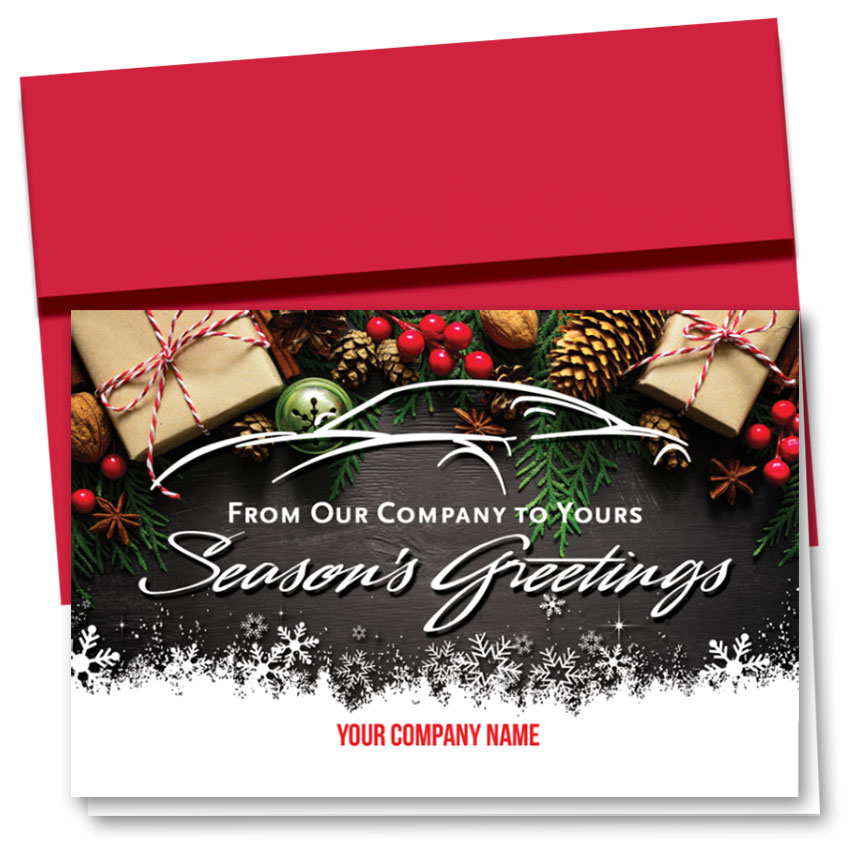 This double personalized card features your company name on the front so that it becomes part of the design! The card inside is printed with the holiday message of your choice and your company name.