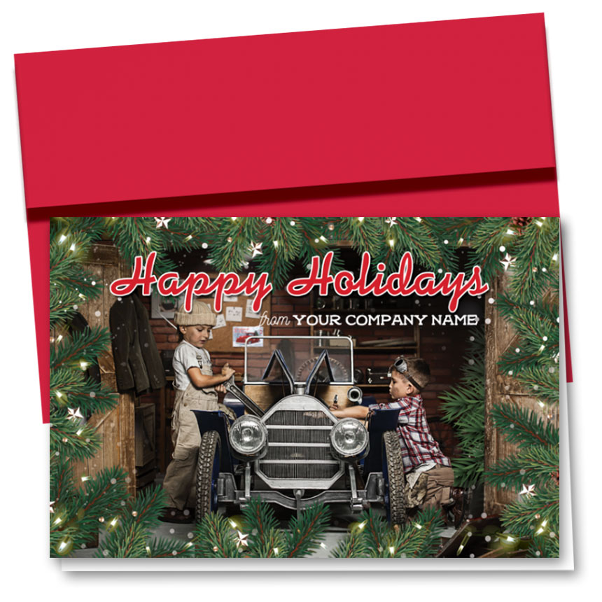 This double personalized card features your company name on the front so that it becomes part of the design! The card inside is printed with the holiday message of your choice and your company name.