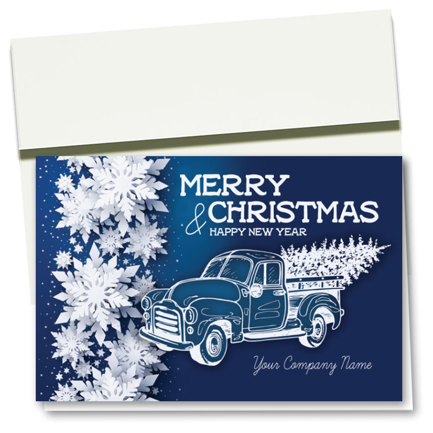 This double personalized card features your company name on the front so that it becomes part of the design! The card inside is printed with the holiday message of your choice and your company name.