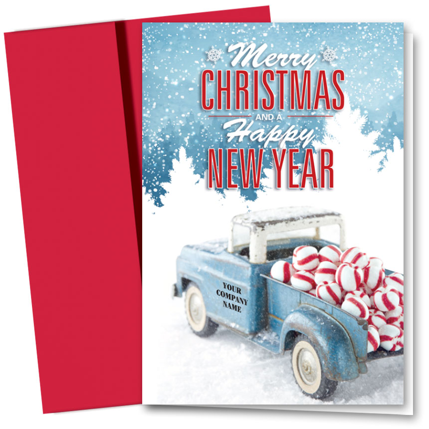 This double personalized card features your company name on the front so that it becomes part of the design! The card inside is printed with the holiday message of your choice and your company name.