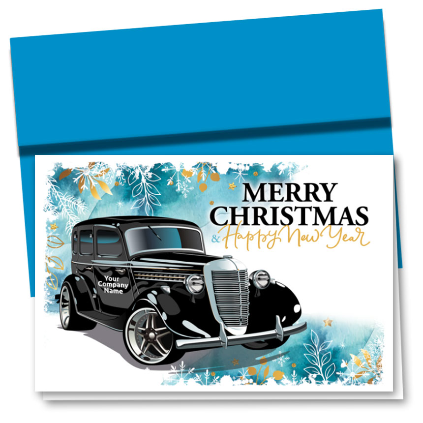 This double personalized card features your company name on the front so that it becomes part of the design! The card inside is printed with the holiday message of your choice and your company name.