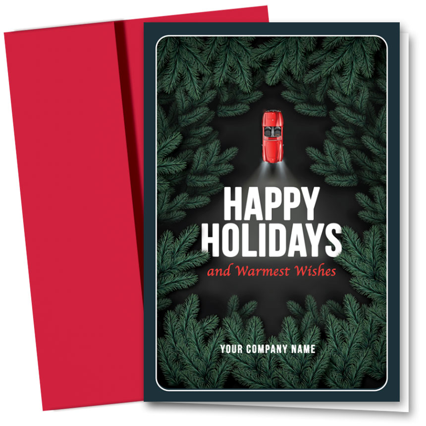 This double personalized card features your company name on the front so that it becomes part of the design! The card inside is printed with the holiday message of your choice and your company name.