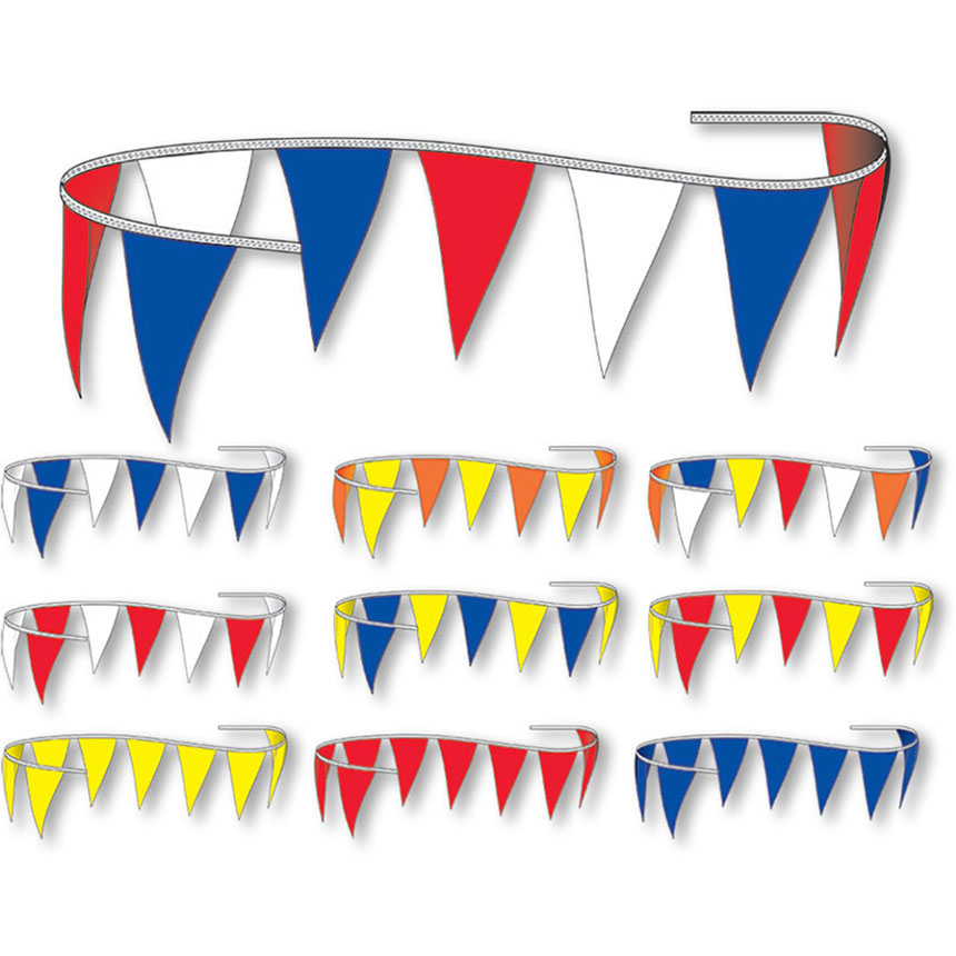 Economy Triangle Pennant is made of 4-mil polyethylene. Short term promotional use only. Works best indoors. They are manufactured by silk screening ink on plastic and they are highly susceptible to inclement weather. 100' of roping: 90' of pennant, 5' of rope at each end to tie off.
