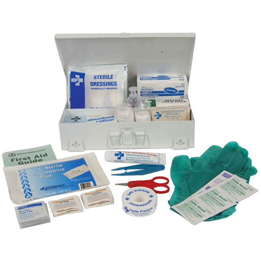 •Sold as a kit with 207 items, including: (100) 1" x 3" Adhesive Strips, (5) Fabric Knuckle Bandages, (5) Fabric Fingertip Bandages, (5) Fabric Extra Large Strips, (4) 3" Gauze Pads, (4) 4" Gauze Pads, (1) Large Wound Pad, (1) 2" Gauze Bandage, (1) 4" Gauze Bandage, (1) Triangular Bandage, (1) Adhesive Tape, (2) Eye Pads with Strips, (4) Exam Gloves, (30) Antiseptic Wipes, (6) First Aid/Burn Cream Packets, (6) Triple Antibiotic Ointment Packets, (24) Pain Relief Tablets, (1) 4 oz. Eyewash, (2) Cold Packs, (1) 2" Elastic Bandage, (1)Scissors, (1) Forceps, and (1)First Aid Guide