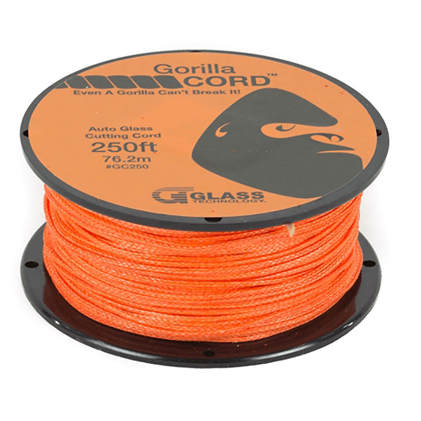 Gorilla Cord(TM) has been engineered and developed to provide maximum durability and strength while continuing to provide safety to the technician.  Gorilla Cord(TM) is a new addition to Glass Technology's family of auto glass cutting line.  In addition to Glass Technology's proprietary Zipline(TM) that provides the same strength and durablity as steel and braided wire in a safe, user friendly synethic €œline" for precision cut outs on OEM and after market vehicles with tight tolerances and expensive hardware, Gorilla Cord(TM) is designed for aftermarket windshields and late model vehicles with old and hard urethane.  The Gorilla Cord's state of the art material was built off of the original Zipline(TM) design with additional tubular fiber reinforcements to increase the strength and the abrasion resistant properties.  Gorilla Cord(TM) features a €œno load under stress" reaction to line breakage. If the line breaks, it will not retract, spin or coil dangerously the way steel and braided wires do. This keeps the technician safe from potential injury.  Gorilla Cord(TM) should only be used for older, harder aftermarket urethanes where additional tensile strength is needed. Available in 250ft. The perfect product for the New FORD F150 with the Alumnium Body Zipline and Gorilla Cord will not cut the Alumnium pincweld like wire or power tools can.