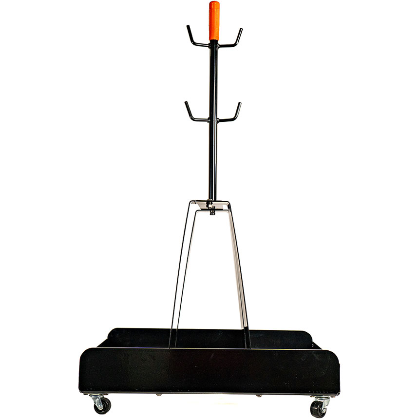Standing 46" tall, this mobile cart can accommodate any size of GUNIWHEEL, including the 45S, 56, 80 and GUNIX. A pair of cross hangers on the handle allow for storage of the interchangeable hubs that fit the GUNIX. These welded pegs can also be used for storing shop tools, such as pneumatic wrenches and air hoses. There is also room on the base for additional storage.