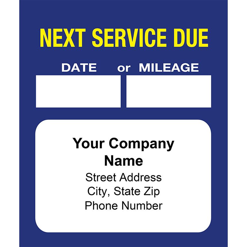 Completely "removable" sticker! Place these colorful service reminders on a vehicle's windshield, dash, doorjamb, or wherever they'll be seen the most! They're printed on a completely removable paper stock that peels away without leaving a sticky residue behind. Durable stickers feature your company imprint and easy-to-write-on boxes for recording the date and mileage.