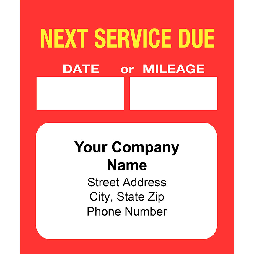 Completely "removable" sticker! Place these colorful service reminders on a vehicle's windshield, dash, doorjamb, or wherever they'll be seen the most! They're printed on a completely removable paper stock that peels away without leaving a sticky residue behind. Durable stickers feature your company imprint and easy-to-write-on boxes for recording the date and mileage.