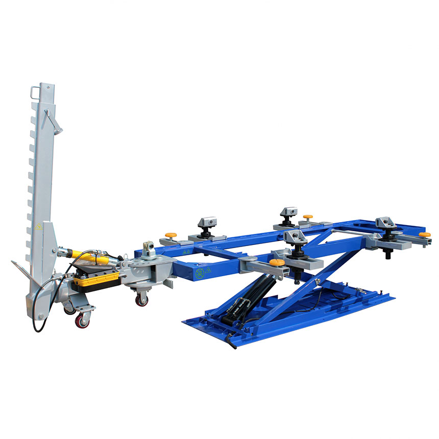 The FR-55 Scissor Lift & Frame Rack is a unique, high quality, compact frame straightening machine with the versatility of an automotive lift, designed to service Full-frame or Uni-body type vehicles with its 5,500 lb. lifting capacity. The FR-55 incorporates a 10 Ton 'multi-angle/adjustable height' Pull Tower with 360 degree pulling capability, along with adjustable height Clamping assemblies and universal positioning Swivel Arms & Lift Pads. The FR-55 also comes standard with Pull Chain with Hook and Wheel Stands.