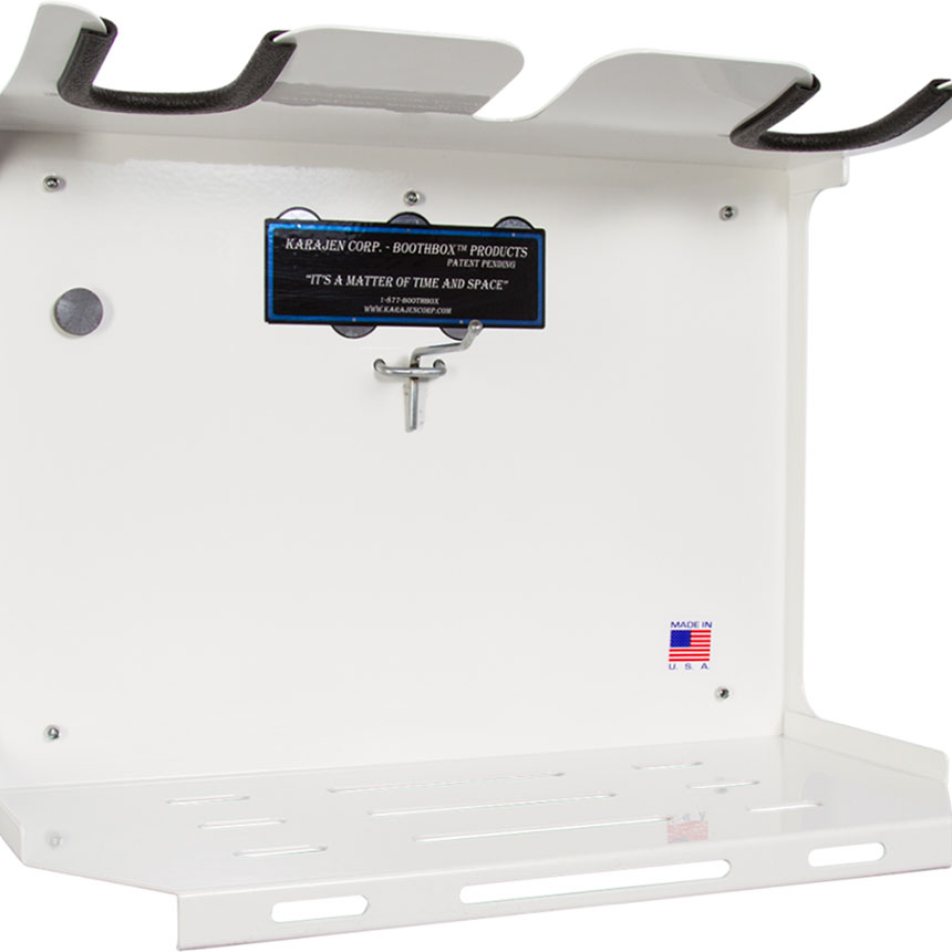 Dimensions: 8 ½" depth of bottom shelf, 7" depth of upper spray gun holding flange.