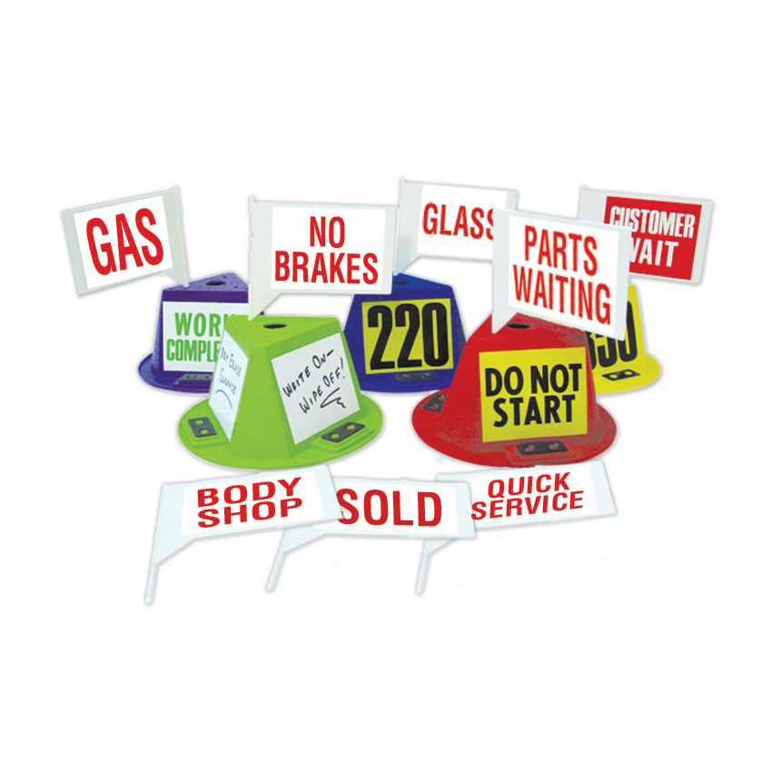 Flags fit securely in holes on top of the magnetic hats to convey additional information. Made of durable plastic. Sign Imprints and colors below.