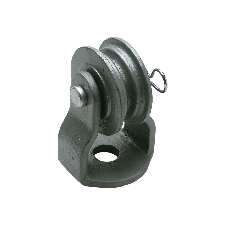 Large 5 inch wheel prevents undue chain wear. Secured with 1 inch heat-treated pin. When used with the #5811 Block Pulley Adapter it offers horizontal pulls.