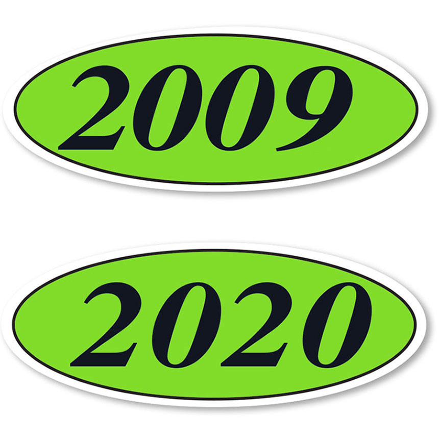 Black & Chartreuse Oval Year Stickers made of durable, waterproof vinyl, these non-fade signs demand attention! Each year sticker is slit on the back for easy application. Black & Chartreuse Oval Year Stickers are neatly shrink wrapped in packs of a dozen with a cardboard backer to prevent curling during storage. Black & Chartreuse Oval Year Stickers measure 14"W x 5 1/2"H.