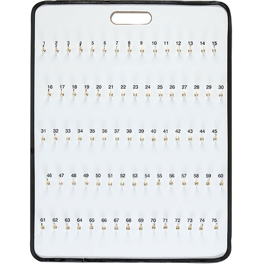 Portable Key Board features spring-lock hooks which erase the fear of keys falling off while in transport. Quality masonite board with metal reinforced trim to protect edges. Comes with 75 easy-open, easy-close hooks. Measures 24"W x 29 1/2"H.