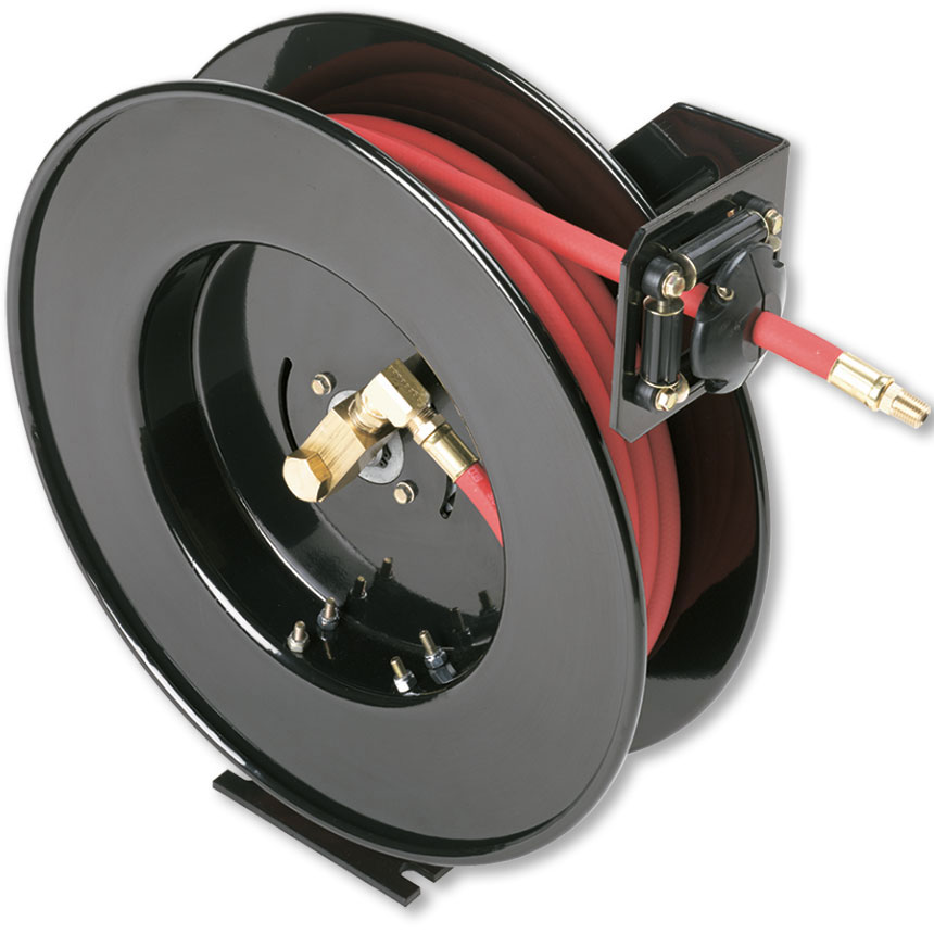 This heavy-duty hose reel comes with a standard multi-purpose hose that can be used for air, water or oxygen/acetylene applications. Heavy gauge steel base and guide arm make it the professionals choice. Pressure rated to 300 psi.