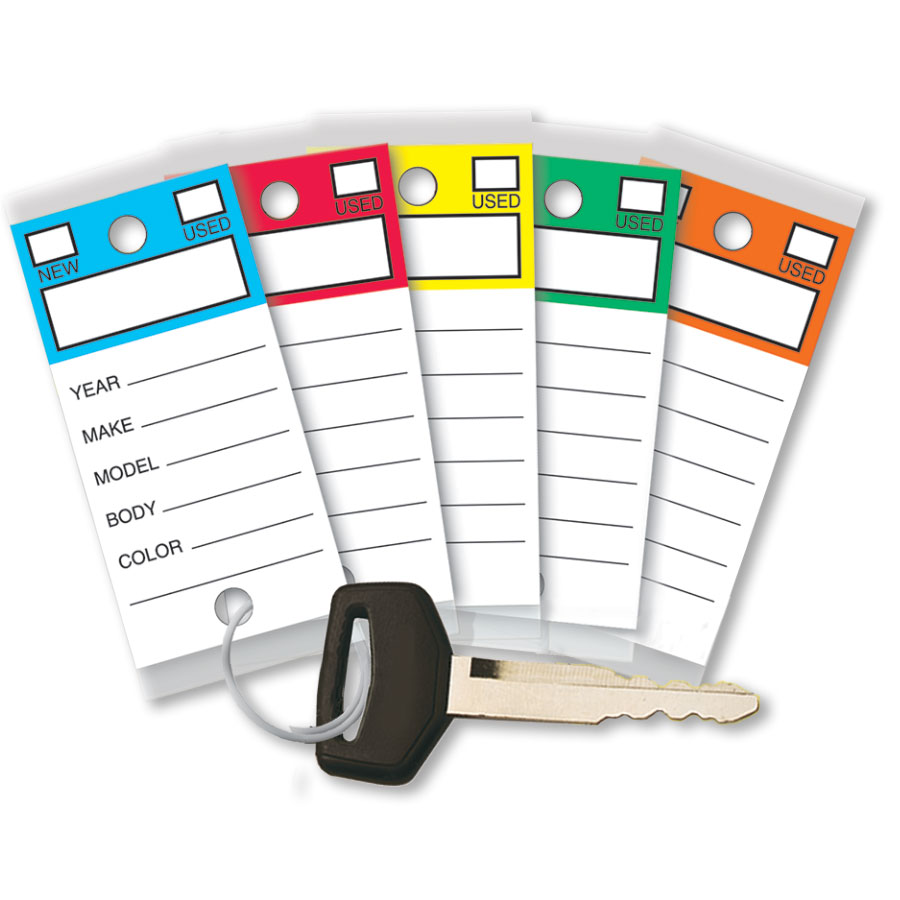 Self-laminating key tags have a protective adhesive plastic cover. This protective cover makes the key tag smudge proof and tear resistant. Choose color; the top of the tag is colored, the bottom is white. Each box of Laminated Key Tags contains 250 rings and 250 tags. Auto dealer tags measure 1 ¼"W x 3"H