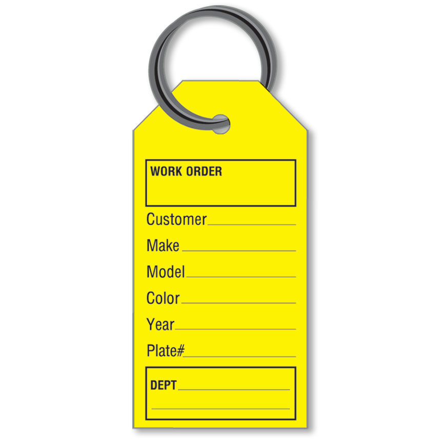 Paper Key Tags For Service Department Auto Service Paper Key Tags are ideal for service departments, body shops, and garages. Bright yellow tags measure 1 ⅜" x 2 ¾". Box includes 500 car key tags and rings each.PREV SKU#F2250