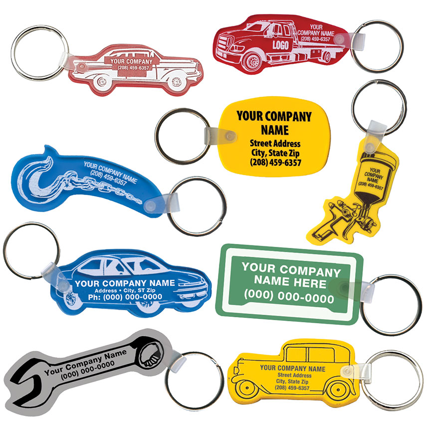 Fun shapes and stand-out colors make these soft-feel key rings the perfect showcase for your company imprint. Key rings are crafted of strong, flexible vinyl and are equipped with a sturdy ring and clip.
