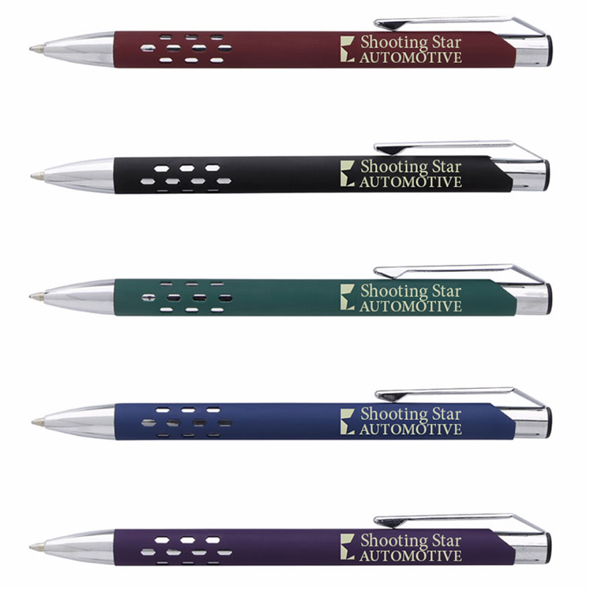 The fully rubberized metal Armor Pen makes a statement with vivid jewel-tone barrels accented by a chrome tip, clip, and die-cut grip design.