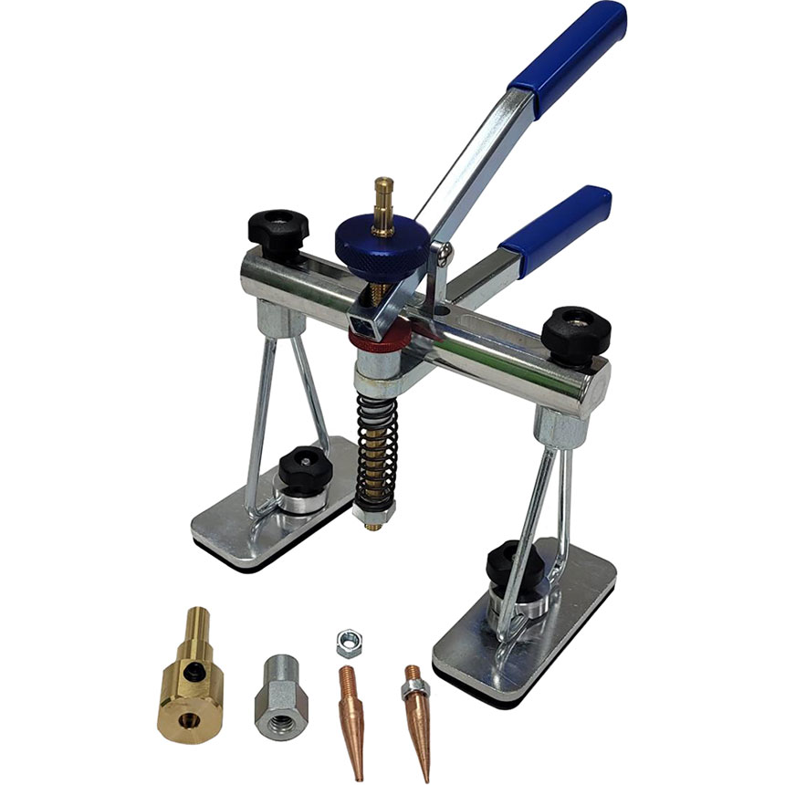 The spring-loaded squeeze puller and its padded feet rests around the repair area for added leverage to assist your Dent Repair needs. Includes four different ends to adjust to the jobs you need.