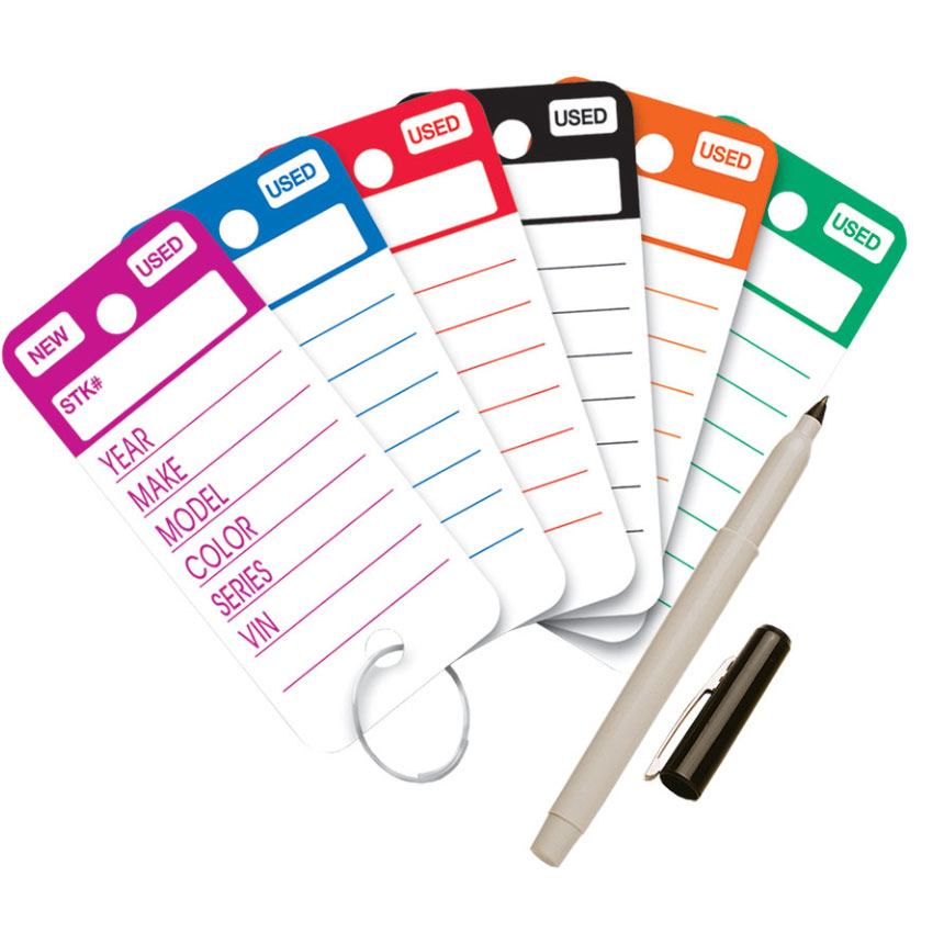 Top stripe Poly Key Tags are tear-proof, waterproof, grease proof, crush proof and fade proof plus have rounded corners to prevent them from catching in your pockets. These key tags come in boxes of 250 tags and rings, as well as 1 free marking pen. Plastic key tags are available in a variety of colors and measure 1 3/8"W x 3"H.