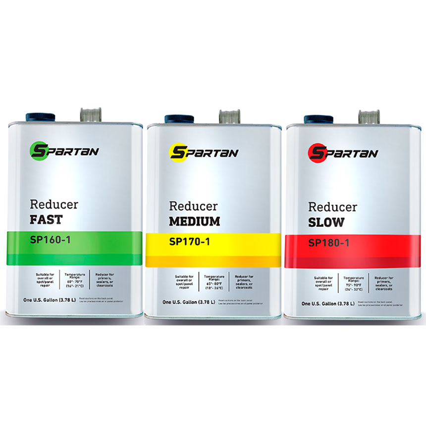 Spartan Reducers deliver a combination of value and quality for use in primers, sealers, clearcoats and other refinish products. They are compliant with the National Rule overning VOC emissions. Note: Spartan Reducers are not compatible with No Mix Basecoat.