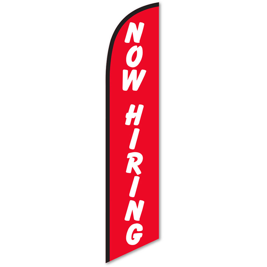 Our Now Hiring Wind-Free Feather Flags are an excellent choice for attracting job applicants and new hires. These knit polyester flags feature double sewn hemmed edges, hemmed sleeve, and include a convenient rope tie on the bottom to prevent pole wrapping. Printed on one-side, reading reverse on the opposite side, they are manufactured with a strong, reinforced black oxford sleeve that hides dirt and is designed to withstand high winds over time. A windless, full-sleeve design keeps your message visible even without wind. Flags measure 11 1/2" x 2 1/2".