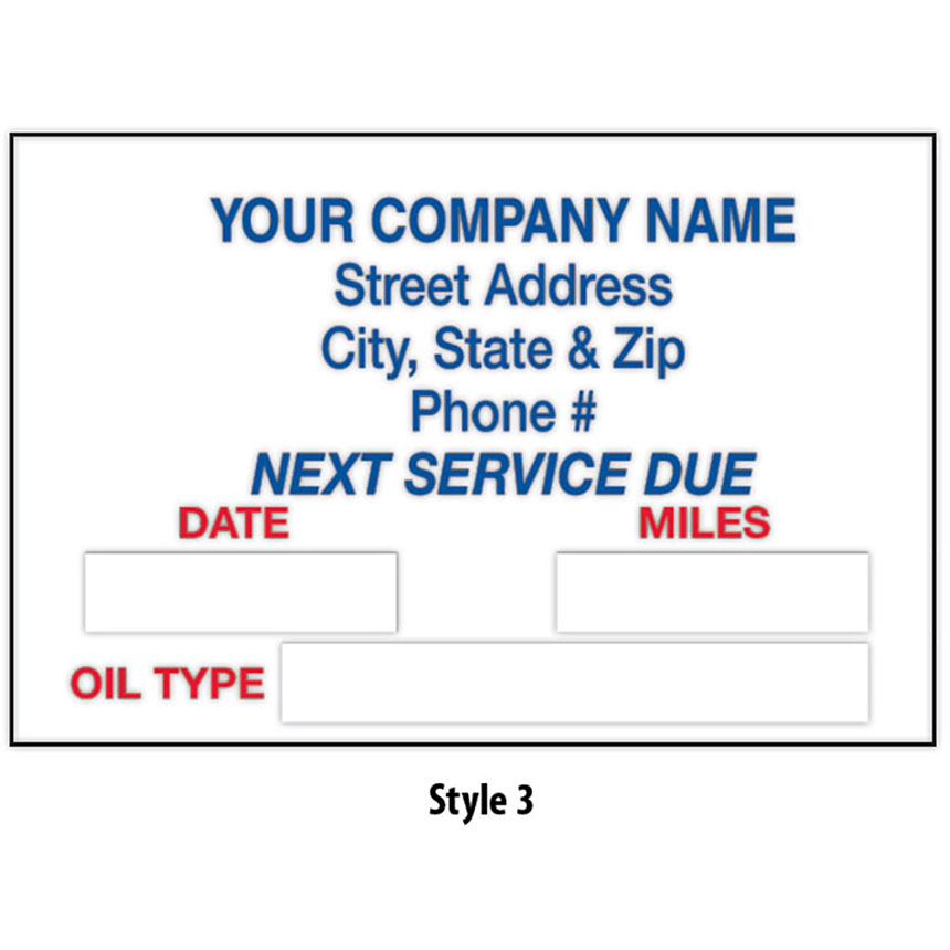 Keep your company name in front of customers. Place on windshield as a helpful reminder to customers and bring in more business! Static Cling material sticks to inside of windshield without adhesive. Clear sticker with white write-on portion for mileage and date when next service is due.